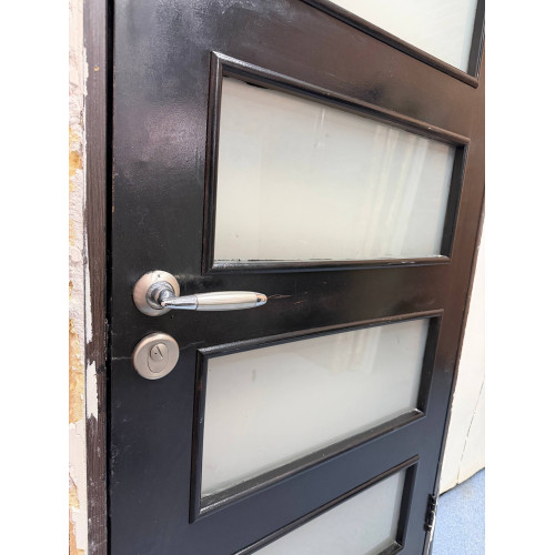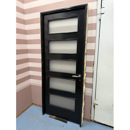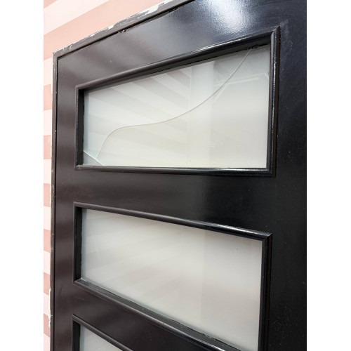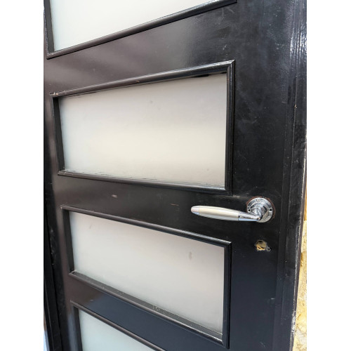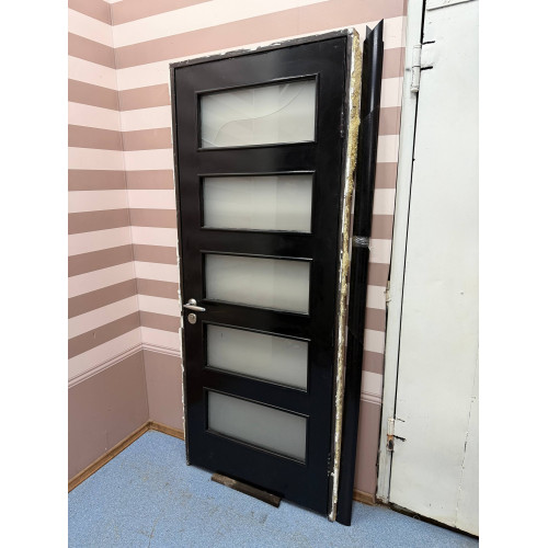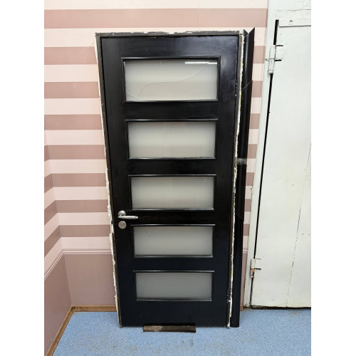 Характеристики: Каркас полотна - дерево Покриття - по фарбовані Відкривання - праве Ширина - 206 мм Висота - 860 мм Матеріал дверної коробки - дерево Двері ширина - 200 мм Двері висота - 800 мм Замок - без замка Колір - чорний Додатково - з маленькими горизонтальними вікошками 5шт. Стан - Уживаний товар, з одніє сторони немає накладки на ручки та тріснуте одне вікошко