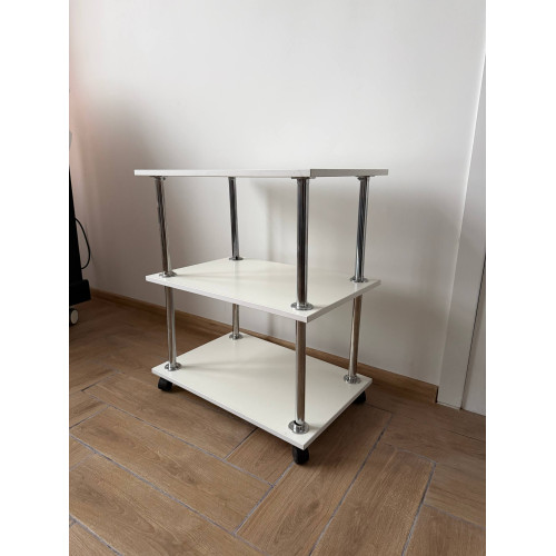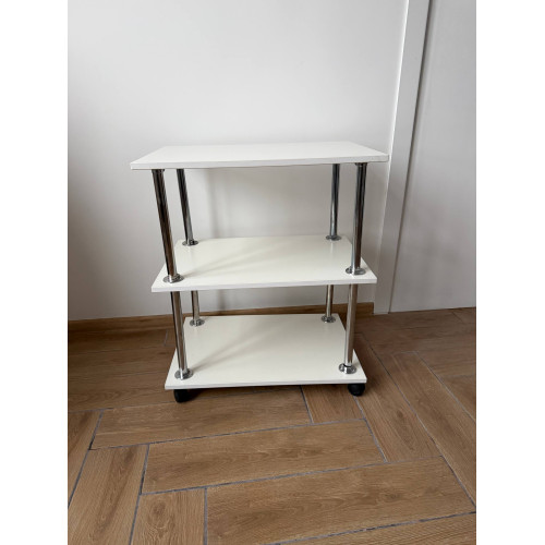 Біла полиця на колесах із трьома полицями — це зручне та функціональне рішення для зберігання речей у домі або офісі. Завдяки мобільній конструкції полицю легко переміщати між приміщеннями, а компактні розміри дозволяють розмістити її навіть у невеликому просторі. Лаконічний дизайн у білому кольорі гармонійно поєднується з будь-яким інтер’єром. Полиця перебуває у стані нової, без слідів експлуатації.