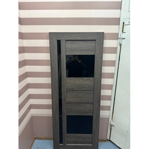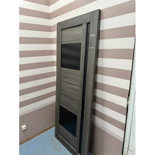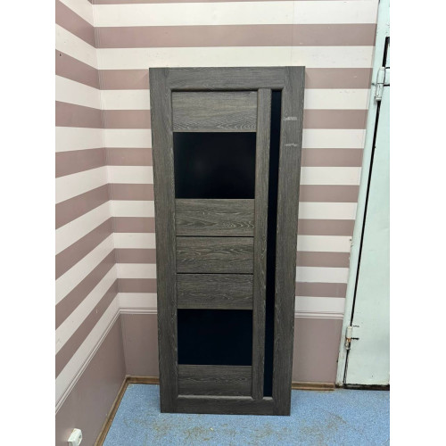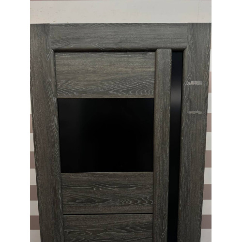 Міжкімнатне дверне полотно «Грета» — стильний варіант для сучасного інтер’єру. Виконане у сіро-коричневому кольорі з вираженою текстурою дерева, що надає дверям природного та естетичного вигляду. Дизайн доповнений двома декоративними чорними скляними вставками та вертикальним склом на всю висоту полотна, що додає легкості та візуально розширює простір.