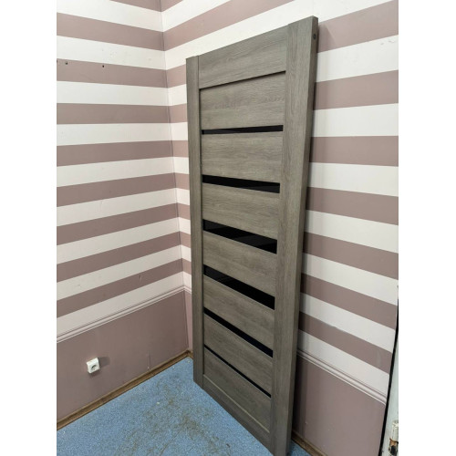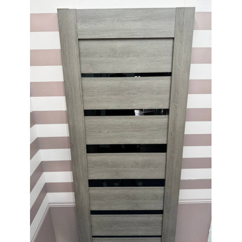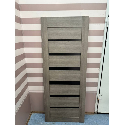 Міжкімнатне дверне полотно ТМ ОМІС «Сіті» — сучасне рішення для стильного інтер’єру. Виконане у сірому кольорі з текстурою дерева, що виглядає стримано та елегантно. Дизайн доповнений шістьма горизонтальними вставками з чорного скла різних розмірів, які додають дверям оригінальності та сучасного характеру.