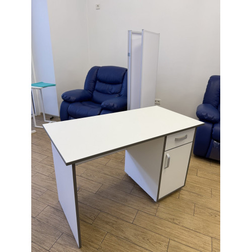 Функціональний та зручний варіант для медичного кабінету, клініки або лабораторії. Стіл має висувний ящик для зберігання документів чи інструментів, а також полиці з дверцятами для додаткового зберігання.